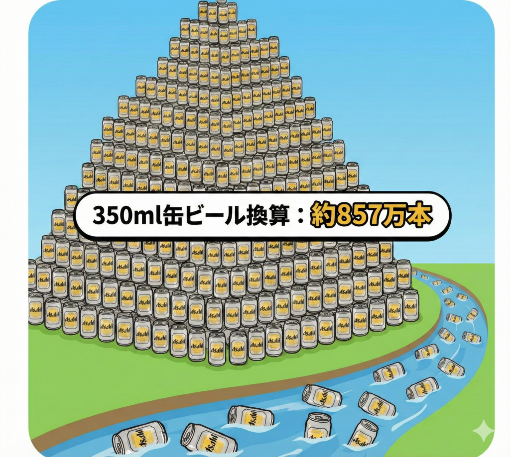 ※350ml缶ビールで857万本がどのくらいかを絵にしてみました。このピラミッドが2000個という規模感になります。
